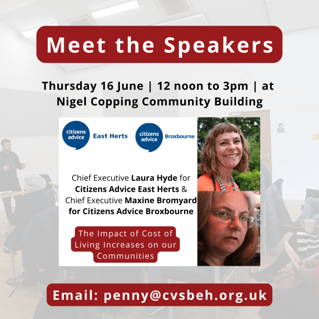 We are only a few weeks away from our June 16 Summer Conference that is being held at Nigel Copping Community Building in Stanstead Abbotts, 12 noon to 3pm. One topic that is sure to be of interest to everyone is the Impact of the Cost of Living Increases on our Communities, which will be delivered by the CEO of Citizens Advice East Herts and Citizens Advice Broxbourne.