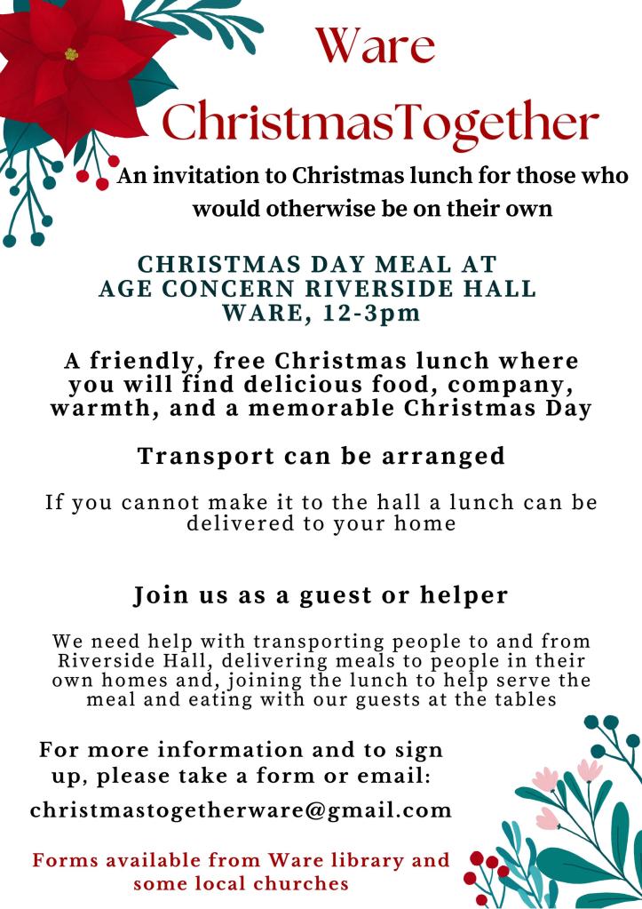 Ware Christmas Together is on again this year! A wonderful chance for anyone who would be alone on Christmas Day to get together and share Christmas lunch.