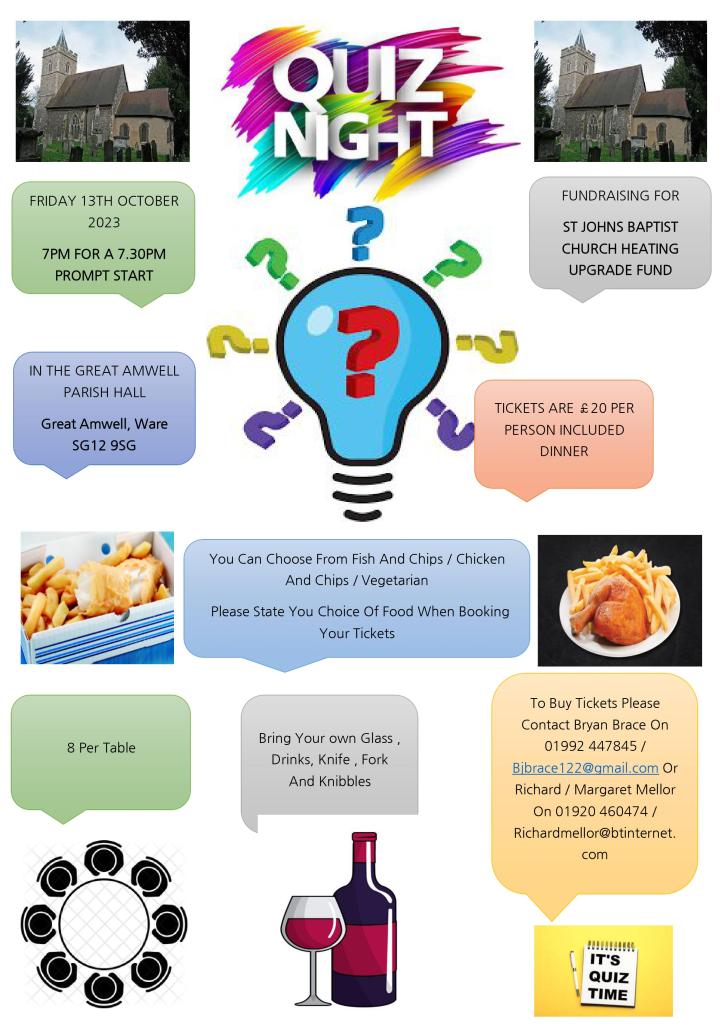 Come along to an evening of quiz fun in aid of St John the Baptist Heating Replacement Fund on Friday 13th October, 7pm for a prompt 7.30pm start, at Great Amwell Parish Hall.