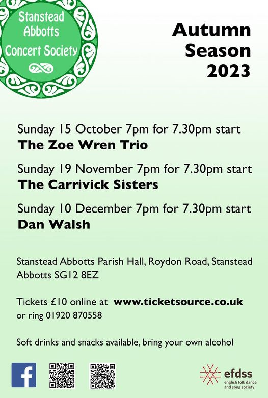7.30pm start (doors open at 7pm) at Stanstead Abbotts Parish Hall on Roydon Road.
