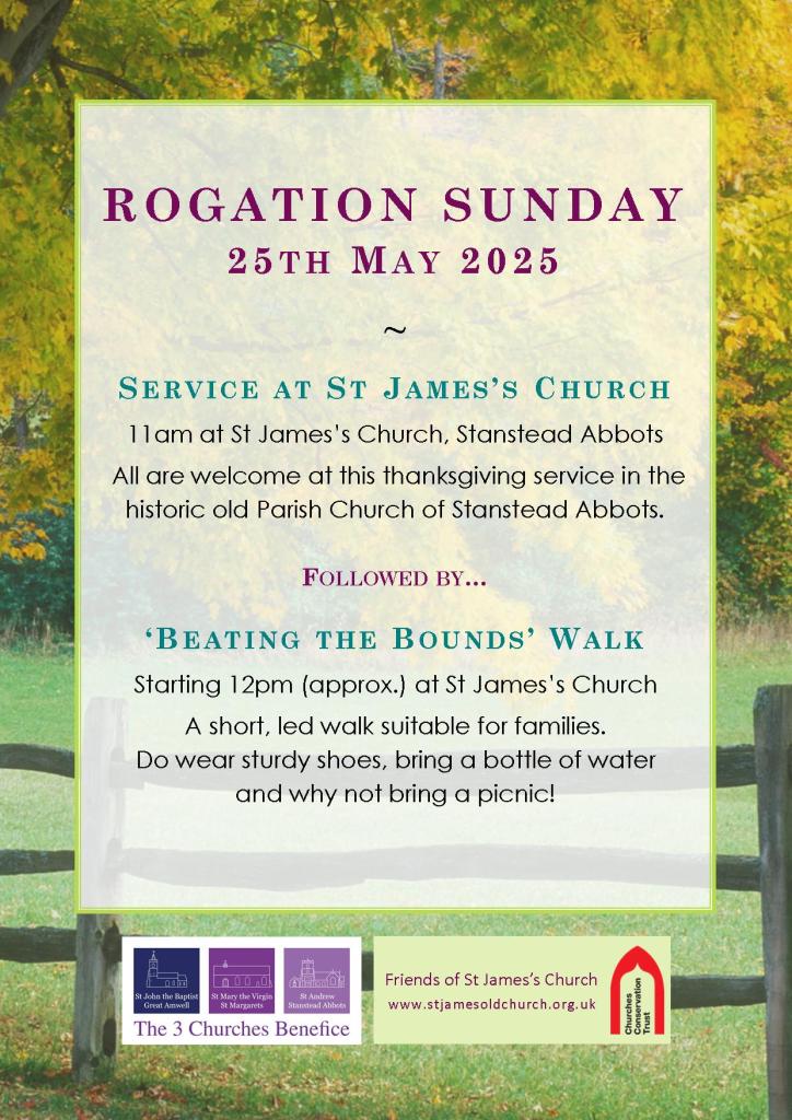You are invited to the annual Rogation Day Service at St James’ Church, Roydon Road, Stanstead Abbotts on Sunday 25th May 2025 at 11am. All are welcome to this special thanksgiving service in the beautiful old Parish Church of St James.