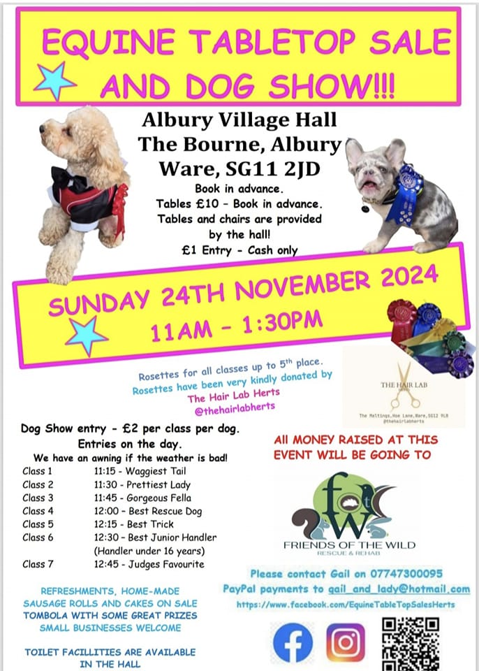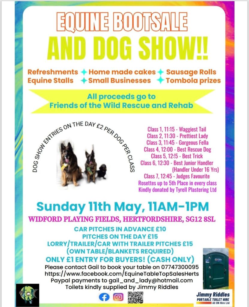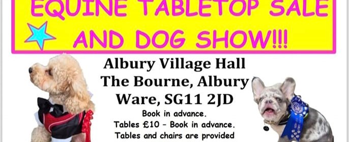 The next Equine Table Top Sale and Dog Show on Sunday 11th May will be held on Widford Playing Fields (SG12 8SL), 11am to 1pm.