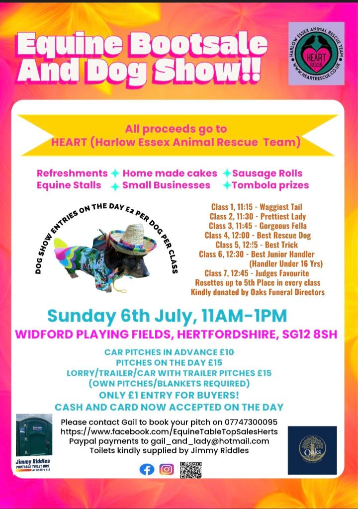 The next Equine Bootsale and Dog Show on Sunday 6th July will be held on Widford Playing Fields (SG12 8SL), 11am to 1pm.