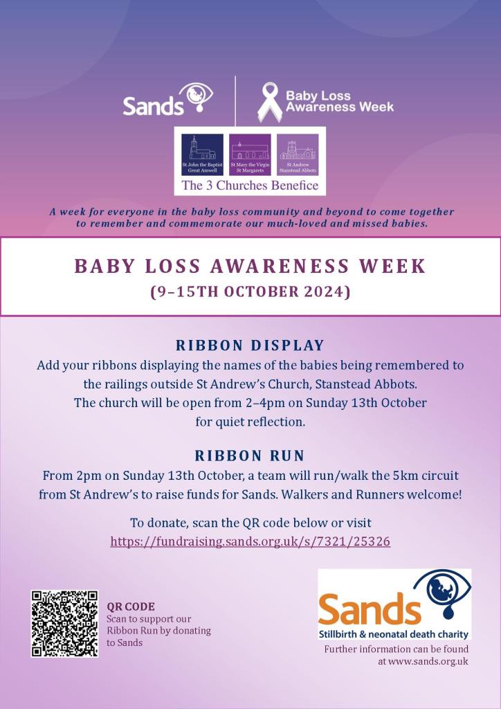 The 3 Churches Benefice is hosting a Ribbon Display outside St Andrew’s Church and opening the church on Sunday 13th October from 2–4pm to support their Ribbon Run, which will take place from 2pm that day. They are putting together a team that plans to walk the 5km circuit from St Andrew’s to raise funds for Sands. Walkers and Runners welcome! To donate, visit the website: https://fundraising.sands.org.uk/s/7321/25326.