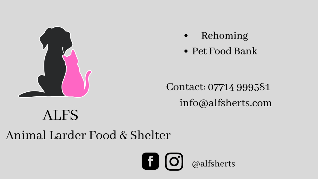 ALFS, Animal Larder Food and Shelter, is a free food bank based in Hertfordshire providing food parcels and accessories for families with pets. They can also help with fostering or rehoming.