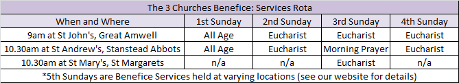 Since June, a new rota of services has been in place for The 3 Churches Benefice of Great Amwell with St Margarets and Stanstead Abbots. Details are as follows: